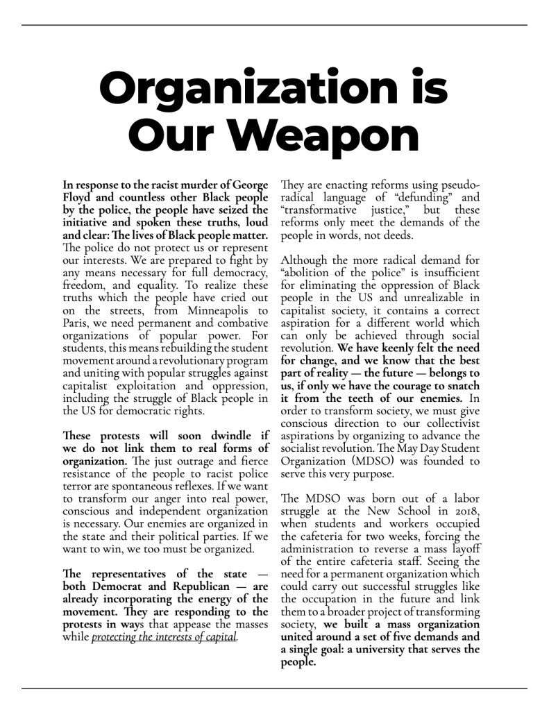 Although the more radical demand for “abolition of the police” is insufficient for eliminating the oppression of Black people in the US and unrealizable in capitalist society, it contains a correct aspiration for a different world which can only be achieved through social revolution. We have keenly felt the need for change, and we know that the best part of reality— the future —belongs to us, if only we have the courage to snatch it from the teeth of our enemies. In order to transform society, we must give conscious direction to our collectivist aspirations by organizing to advance the socialist revolution. The May Day Student Organization (MDSO) was founded to serve this very purpose.